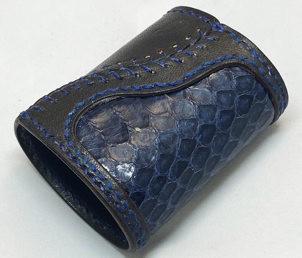 薄い皮を2枚貼り合わせ、内側に水蛇の革をインレイで入れ込みました。