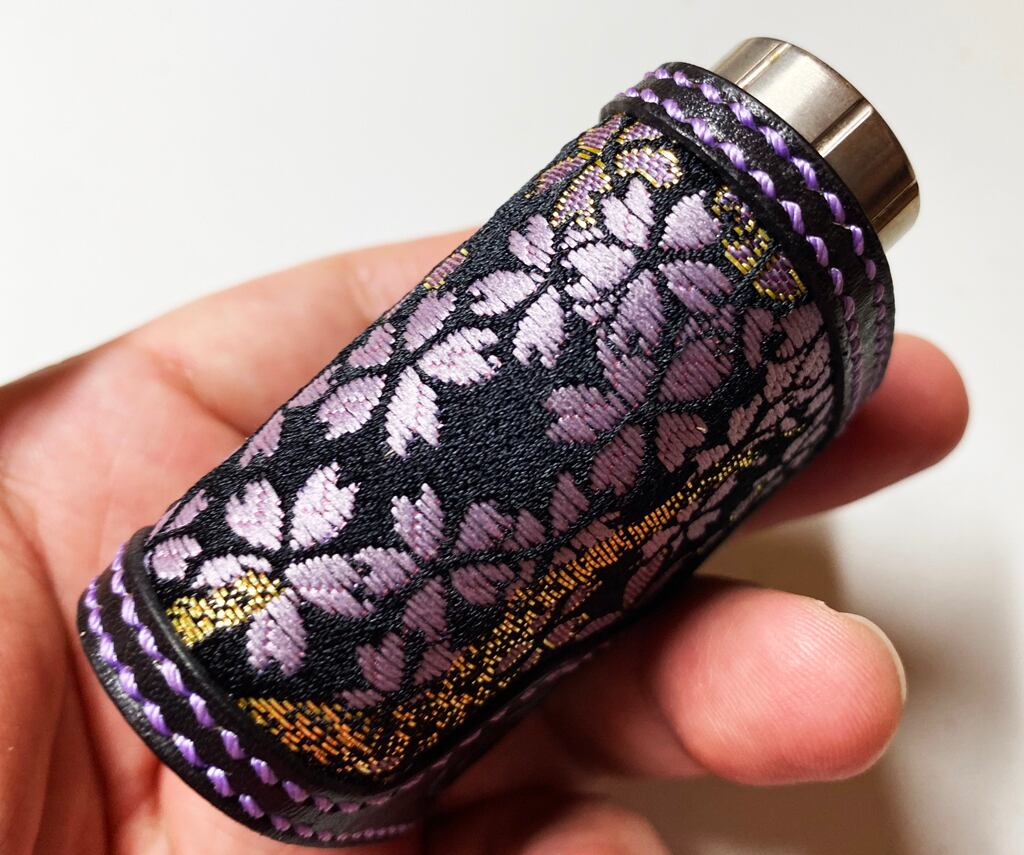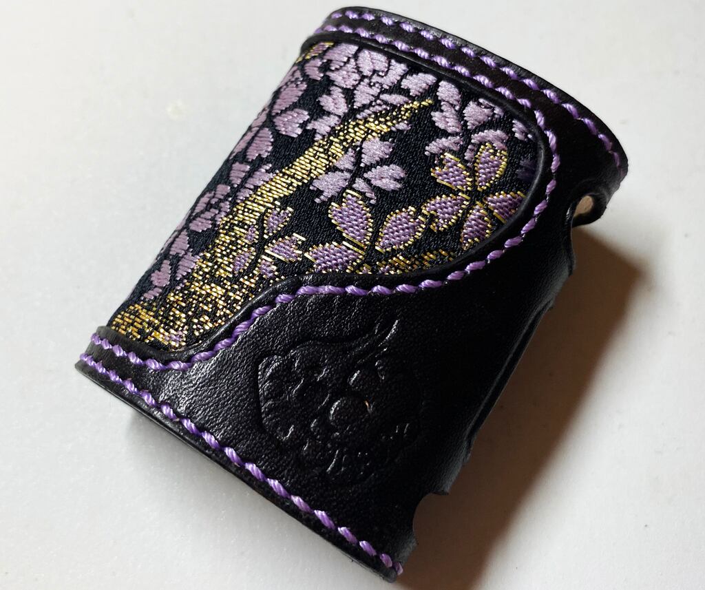 薄い皮を2枚貼り合わせ、内側に西陣織の和布をインレイで入れ込みました。